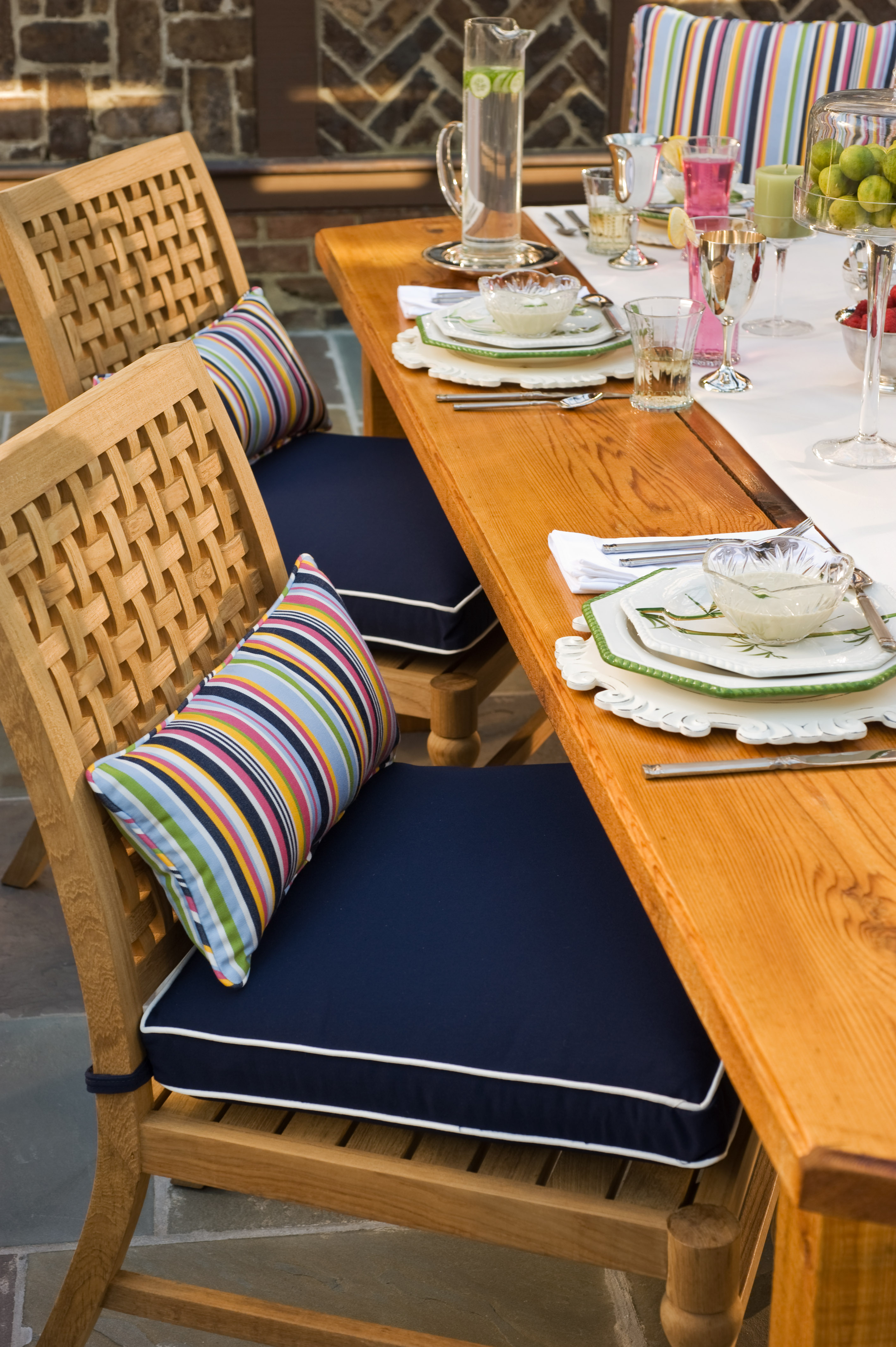 Outdoor dining set with cushions in Canvas Navy and decorative pillows in Steeplechase Malibu. Photo courtesy of Sunbrella.