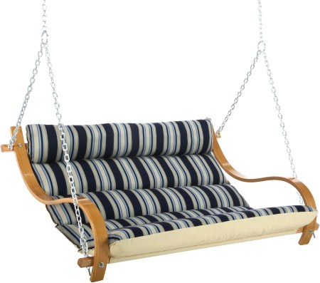 The Hamptons Summer Stripe Deluxe Cushioned Double Swing from The HammockSource is perfect for those looking to add some fun to their porch. Hand-dipped multiple times in honey-gold marine spar varnish, the curvy white-oak frame supports an abundantly wide pillowy seat of cottony-soft, ultra-fade-resistant, all-weather DuraCord fabric sandwiching a lavish layer of polyester fiberfill batting. The fabric, part of the Hatteras Hammocks Mariner collection, features bold stripes in alternating blues, golds and whites.