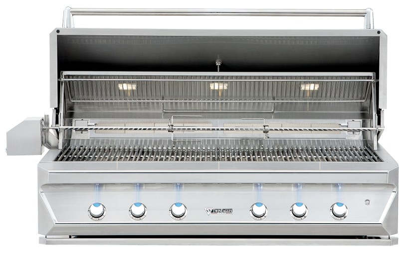 Twin Eagles’ new 54-inch Premium Grill features 14 gauge, 304 stainless steel burners with a 25,000 Btu output and lifetime warranty. It comes with high-quality ceramic briquettes, a variable heat level infrared sear zone, hexagonal grates for more surface-to-food contact, zone dividers to regulate different temperatures, reliable hot surface ignition, and easy-to-open hood assist system. Other features include: interior lights with hood activated light switch for nighttime grilling, decorative LED control panel lights, a multi-position and stow away warming rack, two independently controlled infrared rotisserie burners, and a large capacity smoker box.