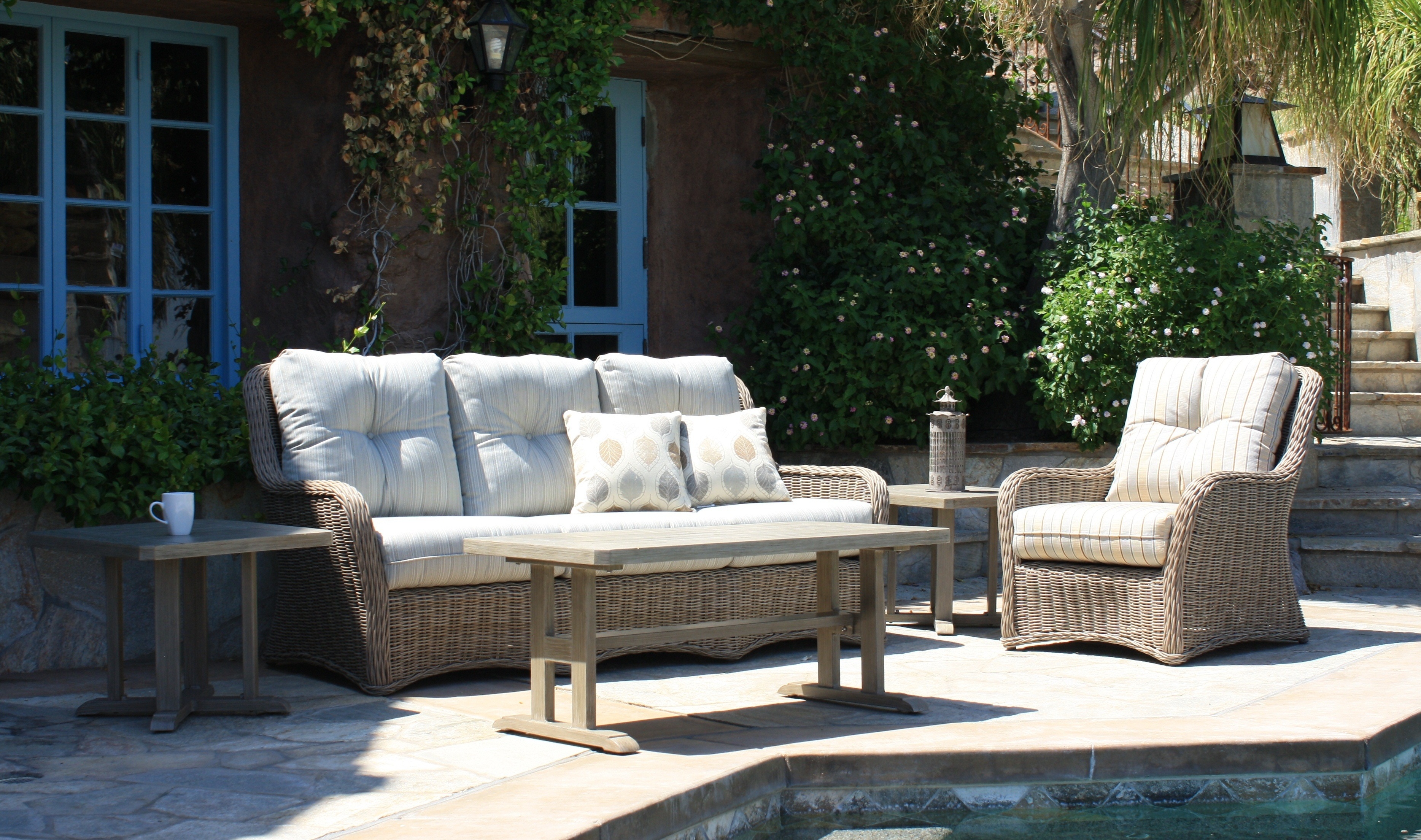 The lovely South Bay deep seating collection by Patio Renaissance features elegant curves in each of its pieces. The Hampton table (in the most popular finish this season – driftwood) complements this beautiful set.