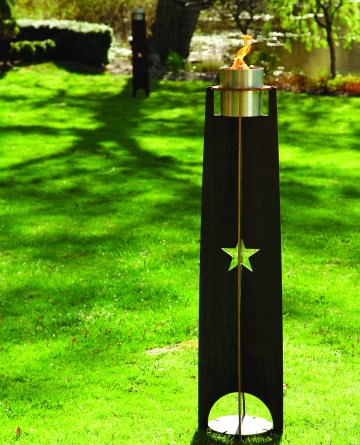 Wittus’ flaming COR-TEN steel torches–in a rich, natural patina–are sculptures by day and dramatic lighting by night. Standing 5 feet and 3.5 feet tall, the Star and MiniStar pillars are made exclusively in the United States and were designed by the Danish Architect, Bent Falk. They are easy to assemble and the odorless liquid gel fuel burns for two to three hours per filling of the container.