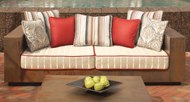 Solarium takes a modern approach to the outdoor room with a khaki and charcoal red color story. The collection includes Maxfield sand on the sofa cushions with a contrasting welt, using solid Cambria cherry. The printed pillows feature Paisley, Grovedale ebony, and Morris ebony stripe. All the prints are on 100% polyester base =cloth and are weather resistant.