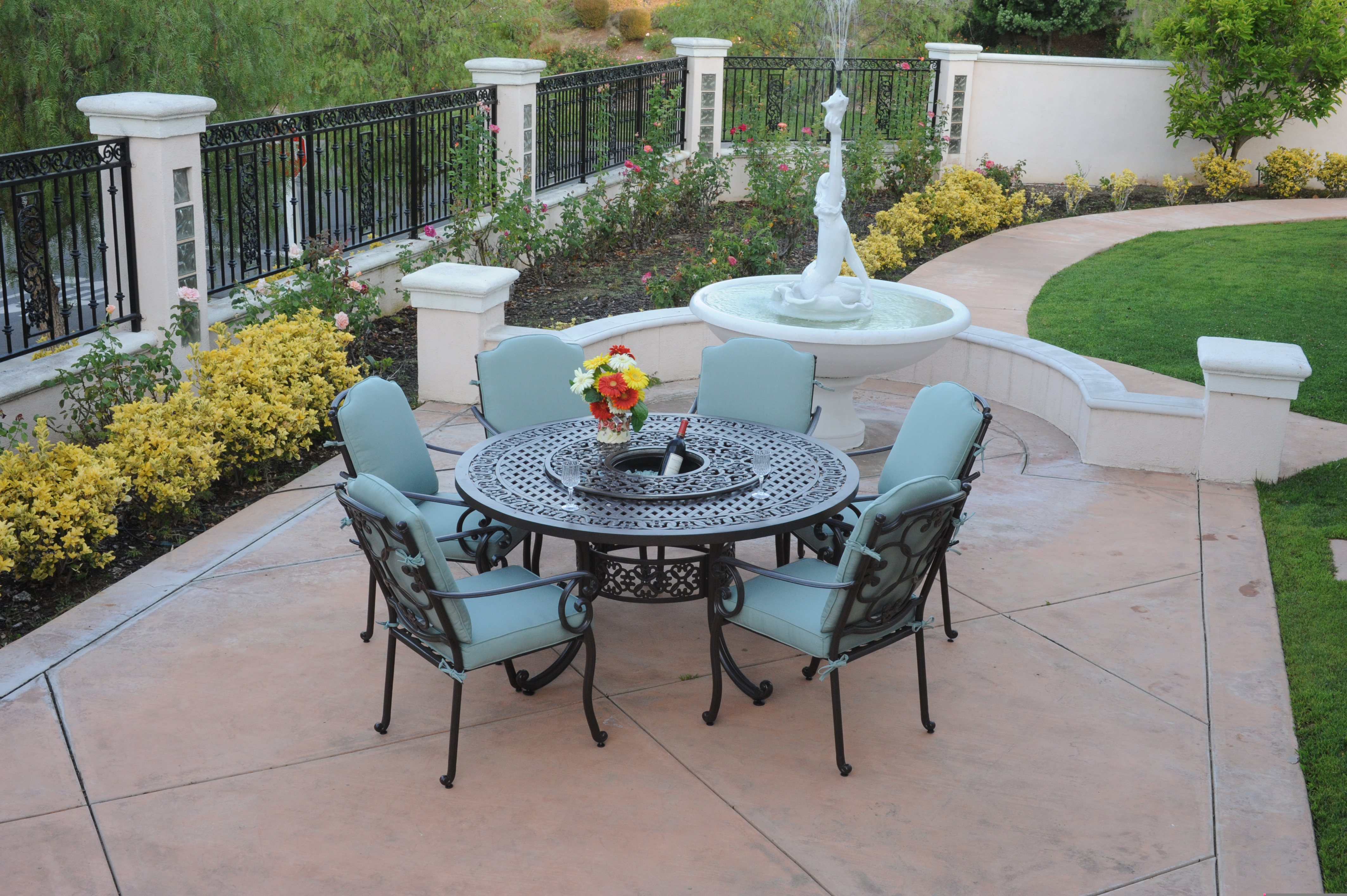 Meadow Decor’s Athena cast-aluminum, powder-coated patio dining set is both durable and stylish. The 60-inch circular table, with a built-in Lazy Susan and an optional ice-bucket accessory, is perfect for customers who love to entertain. Meadow Decor’s luxury dining chair or swivel rocker complements this set.