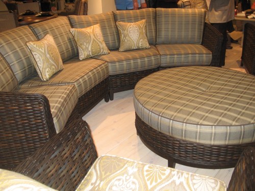 Patio Renaissance – The Catalina Collection is ideal for family and friends and features a roasted pecan wicker, Sunbrella plaid deep seating, and a 48″ ottoman.