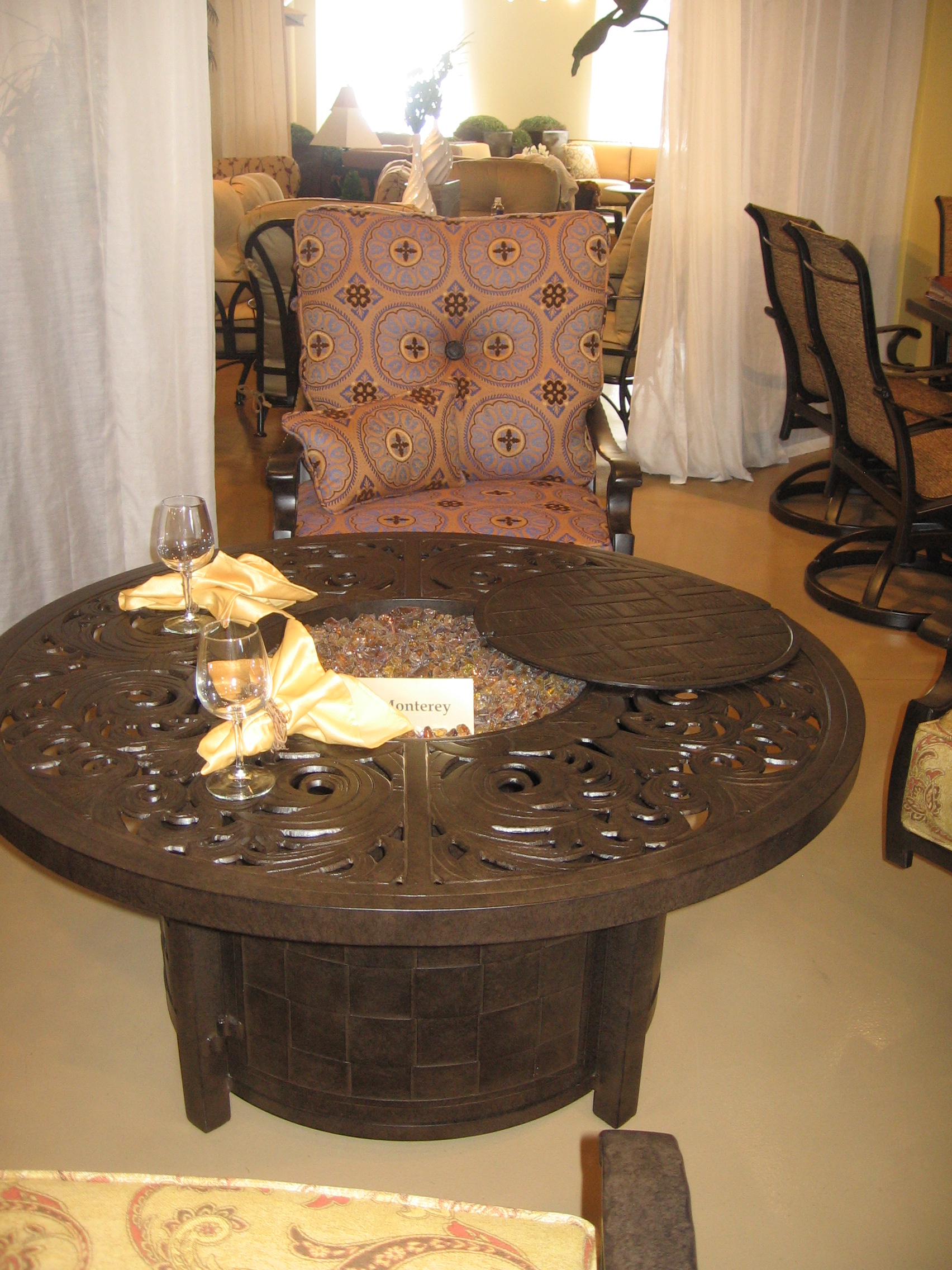 Tropitone – Ravello is a modular seating collection with crescent cushions and ottoman bench. The firepit has a unique pull out shelf for propane tanks.